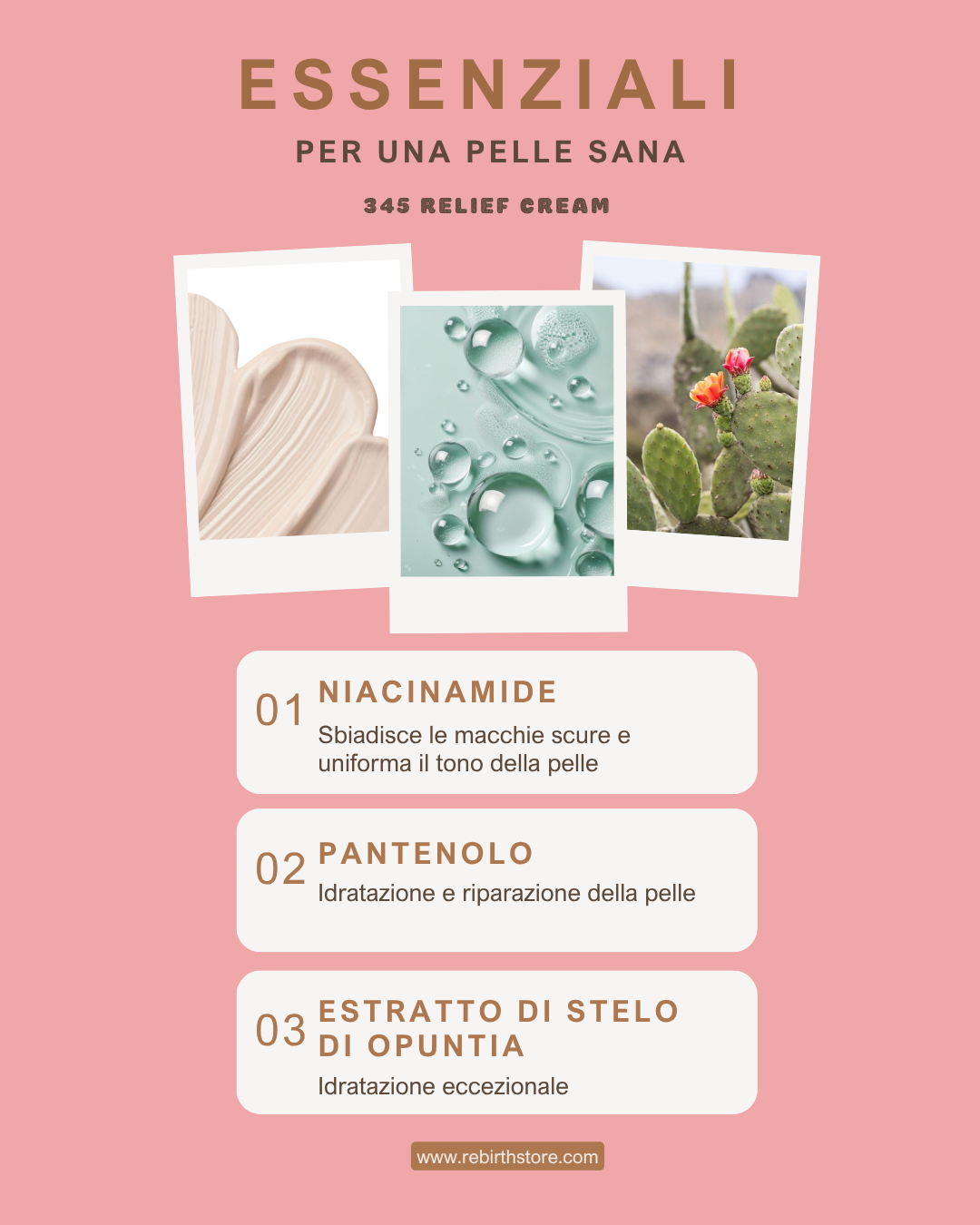 La Crema Relief 345 ti offre un trattamento anti-acne efficace senza il fastidio. Dimentica l'effetto unto e la sensazione di pesantezza; è così leggera che quasi non la senti. Niente arrossamenti o secchezza eccessiva: solo pelle purificata e idratata.